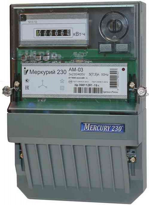Счетчик электроэнергии трехфазный 230 AM-03 5-7.5А класс точн. 0.5S 1 тариф. импульс. вых. на панель мех. ОУ Меркурий